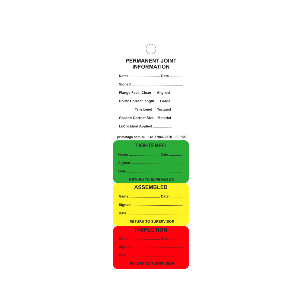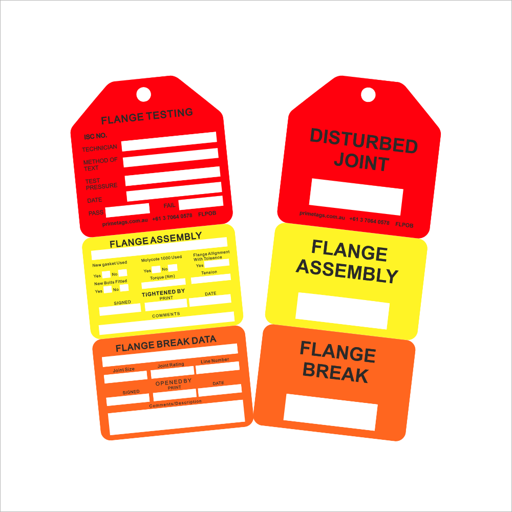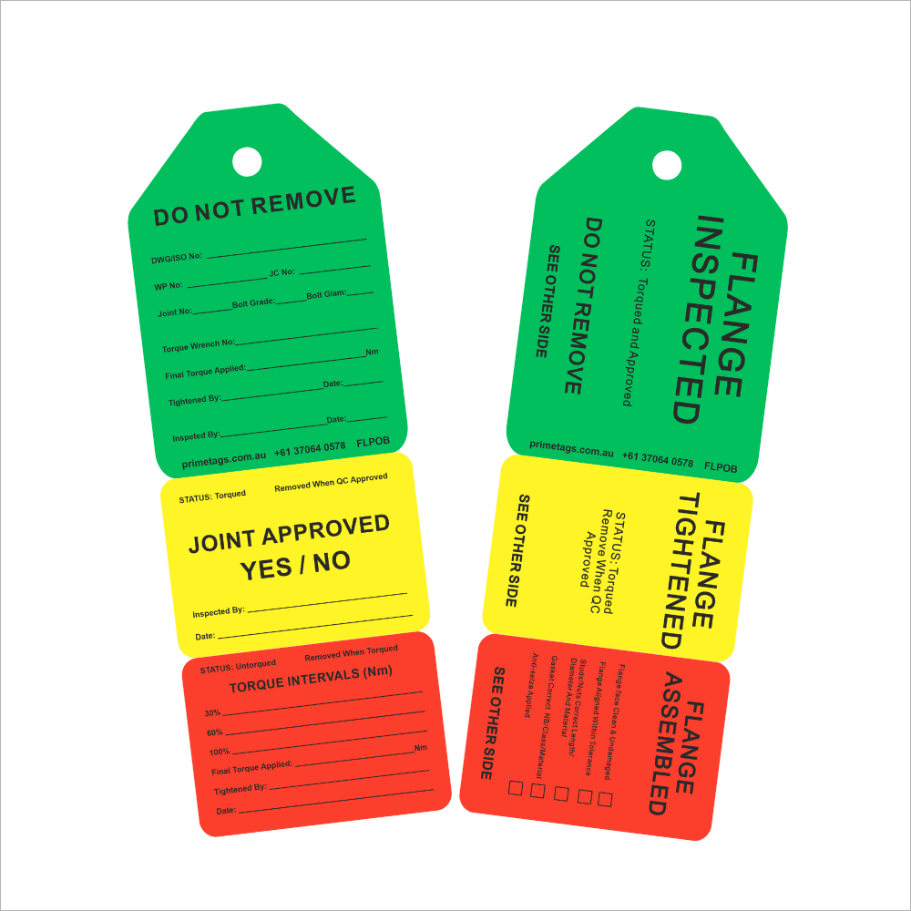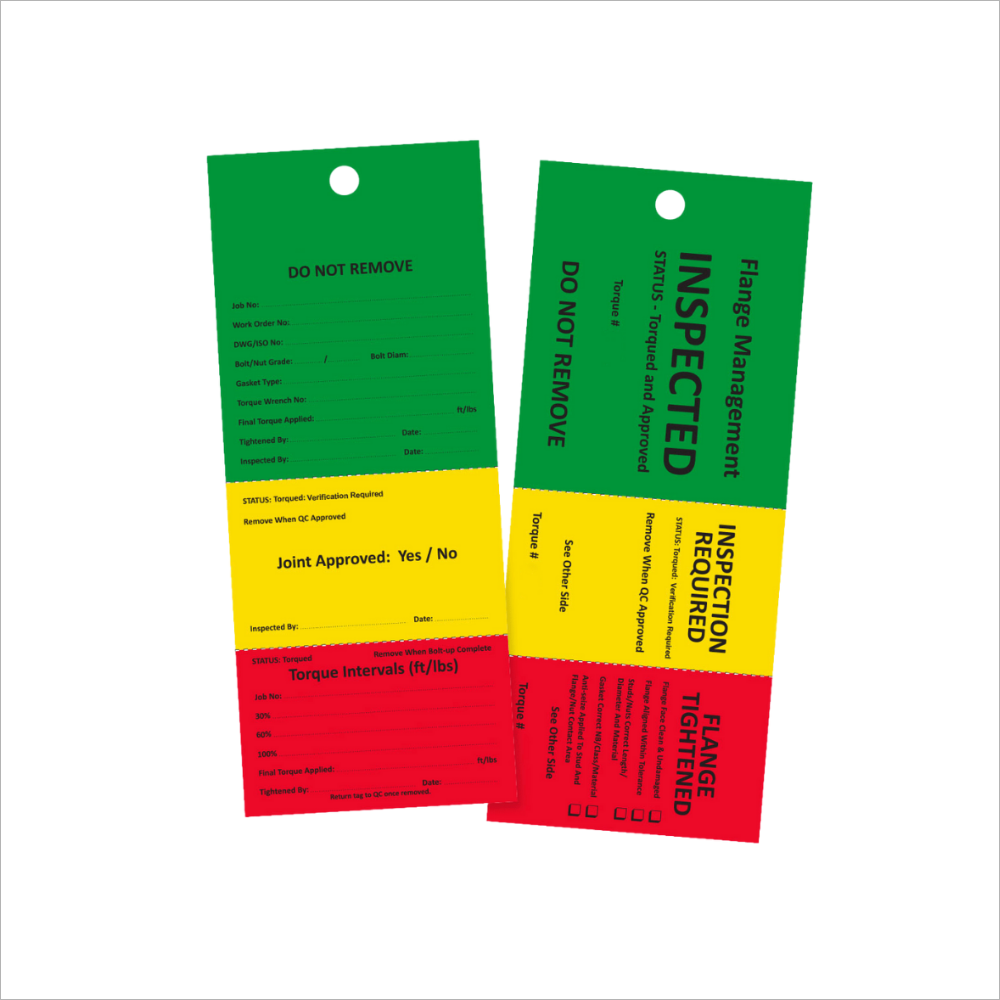 Flange Tags deliver fast, visible status updates on flange integrity using colour-coded tear-off sections for accurate torque management. Also known as torque tags, they simplify flange inspection, joint integrity checks, and breaking of containment protocols across pipeline construction, oil & gas, and energy sector worksites.