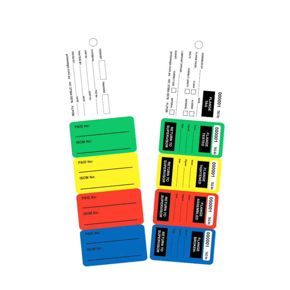 Built for durability, Prime Tags’ heavy-duty flange tags are tear-resistant, UV-stable, and engineered to withstand harsh Australian conditions including weather and chemical exposure. Supporting inspection, maintenance, lockout, and compliance tagging, our fully customisable tags feature colour, numbering, and branding options to meet rigorous industrial requirements.